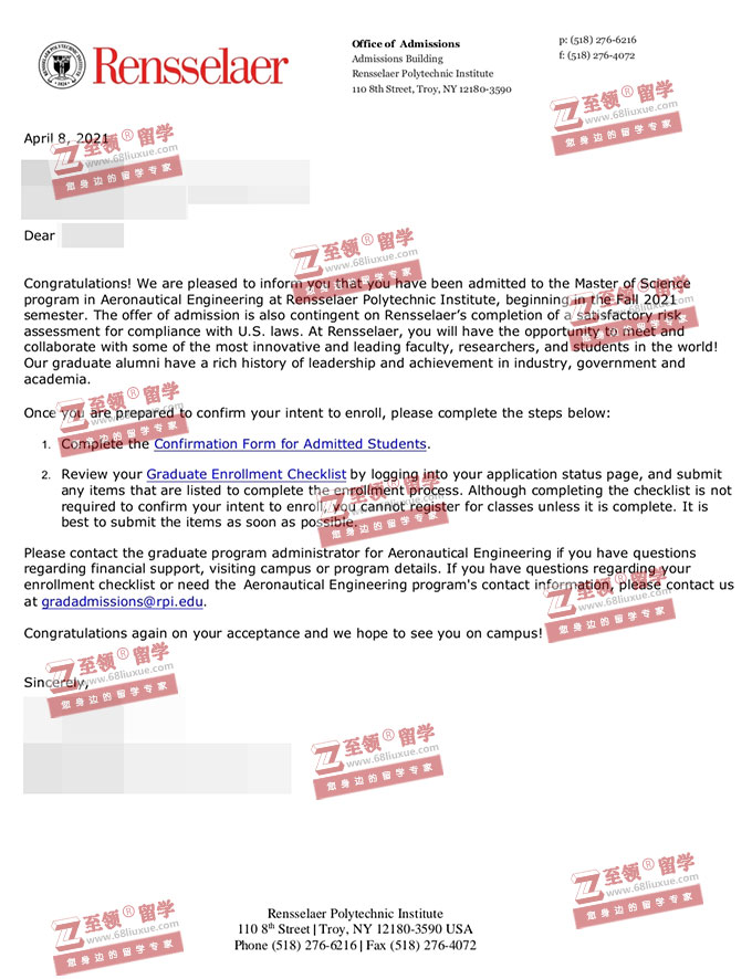 录取结果:RPI,Master of Science program in Aeronautical Engineering伦斯勒理工大学航天工程硕士录取