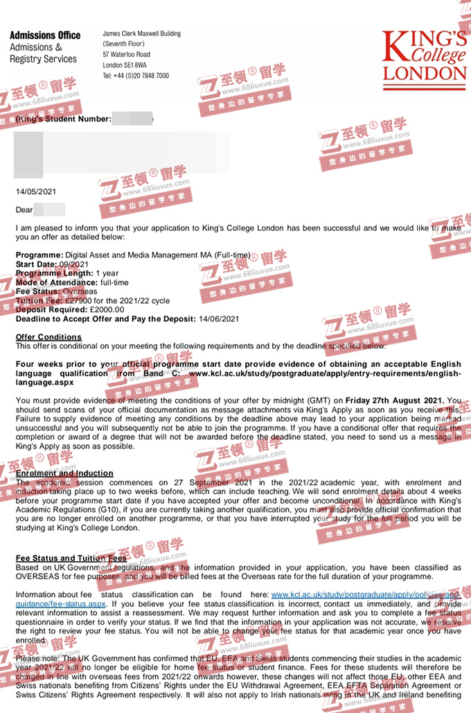 录取结果:KCL,Digital Asset and Media Management MA (Full-time) 伦敦国王学院数字资产与媒体管理硕士录取