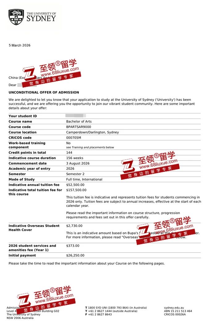 录取结果:悉尼大学,Bachelor of Arts录取