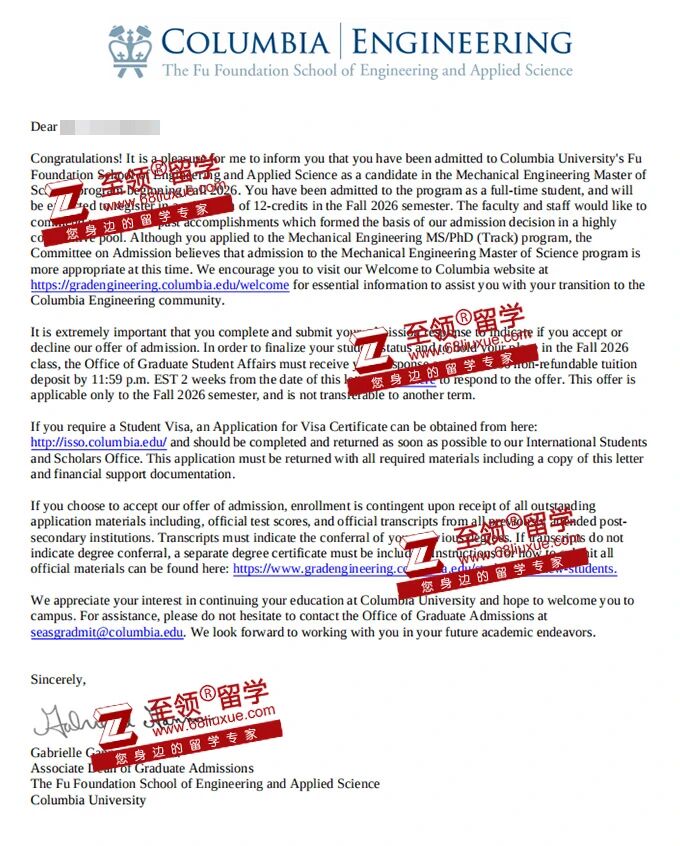 申请过程中,孙老师重点打磨文书材料,突出他在科研项目中展现的问题解决能力与学术潜力,同时联系科研项目导师撰写推荐信,强化学术认可度。最终,X同学不仅拿到哥伦比亚大学机械工程硕士录取,还收到两所TOP50院校的博士项目面试邀请,为未来的学术发展保留了多元选择。