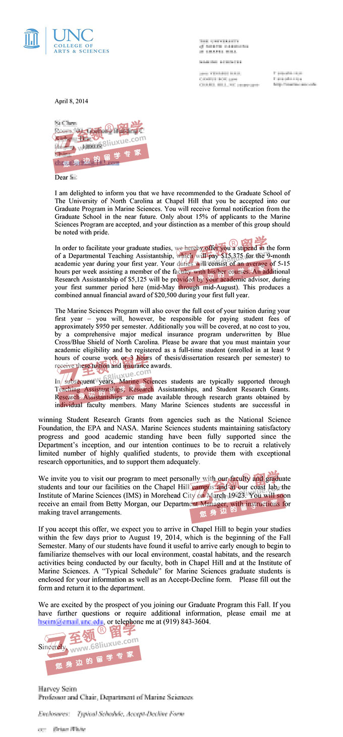 录取结果:北卡来罗纳大学教堂山分校物理学博士PHD,奖学金$50,000