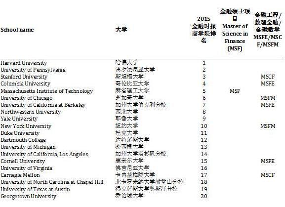 可是事实上确实是这样。下面这张表是2015年Financial Times公布的美国排名前20的商学院,以及他们中哪些有金融硕士项目。