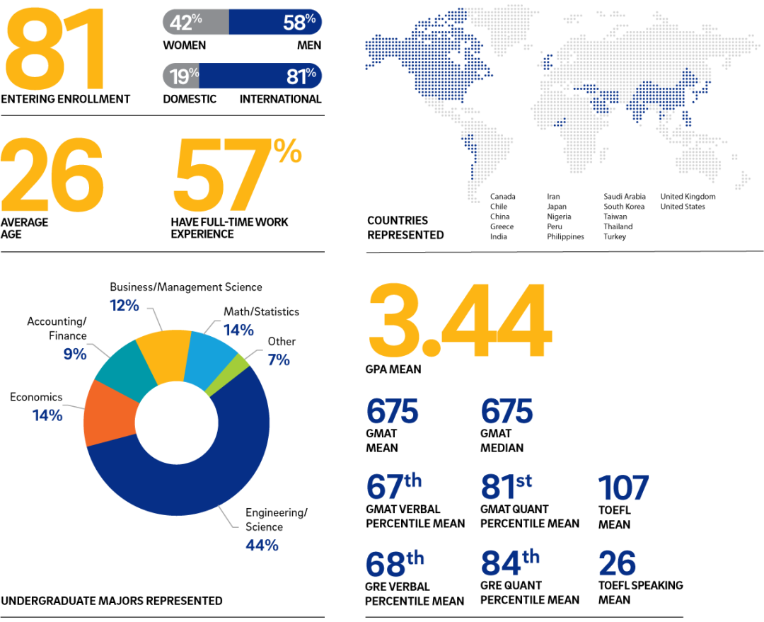 班级规模不算大,国际学生比例挺高(结合上面在美就业比例85.4%,说明国际学生在美就业也很不错),有全职工作经验的略超一半,平均GPA和GMAT不算高,但平均托福较高,目测较看重英语水平,专业背景理工类占据多数,理工科学生申请可能更占优势。