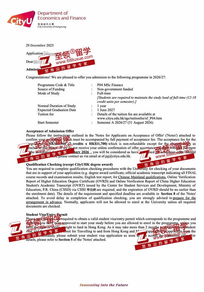 录取结果:香港城市大学金融学硕士录取