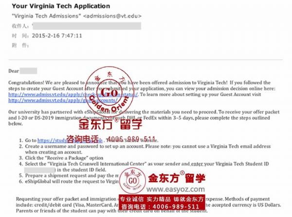 申请过程:何同学家境很好,他从读初中起就有了出国读本科的打算。何同学是一个典型的老实地道的中国孩子,做事情认真严谨,不怎么爱说话,对事情有自己的思想和见解,很独立也很礼貌。他在理科方面有一定的天赋,高中时期的数学、物理经常是高分状态,但他在课外活动方面很欠缺。好在他平时在家喜欢研究电脑,对于硬件了解得比较深入,还自学了一些简单的编程,文书老师正是抓住了他的这个特点,在申请材料中着重描述了他的这一爱好。良好的硬件成绩加上经过包装的软背景,以及金东方留学团队为其打造的完美文书,最终何同学拿到了弗吉尼亚理工大学计算机本科的录取OFFER。