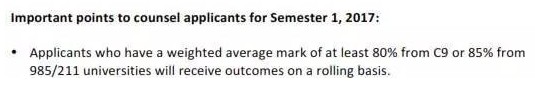 对于条例2中提到的满足C9大学平均分75%-79%,985/211大学80%-84%的学生,这些学生会在2017年第一学期申请递交截止日期—2016年10月31日之前,都会处于一个on hold的状态,即学校在2016年10月31日之后,才开始处理满足这些条件学生的申请,所以这批学生是出offer还是被reject,结果会出来的比较晚,希望让学生提前做好心理准备。