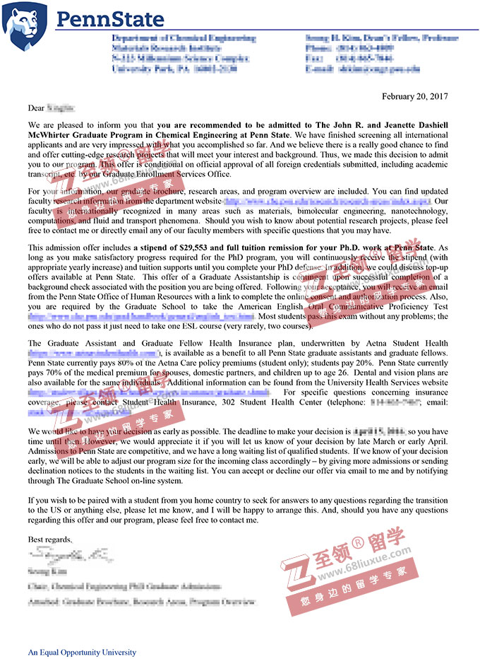录取结果:Penn State University(宾州州立大学),PhD in Chemical Engineering录取,奖学金$29553/年+免学费