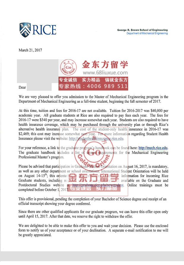 在金东方留学的帮助下,欧阳同学完成了所有的申请,然后是一段苦等OFFER的焦虑日子。3月一封封的OFFER终于纷至沓来,欧阳同学拿到了莱斯大学机械工程硕士的录取,真是太让人兴奋了。