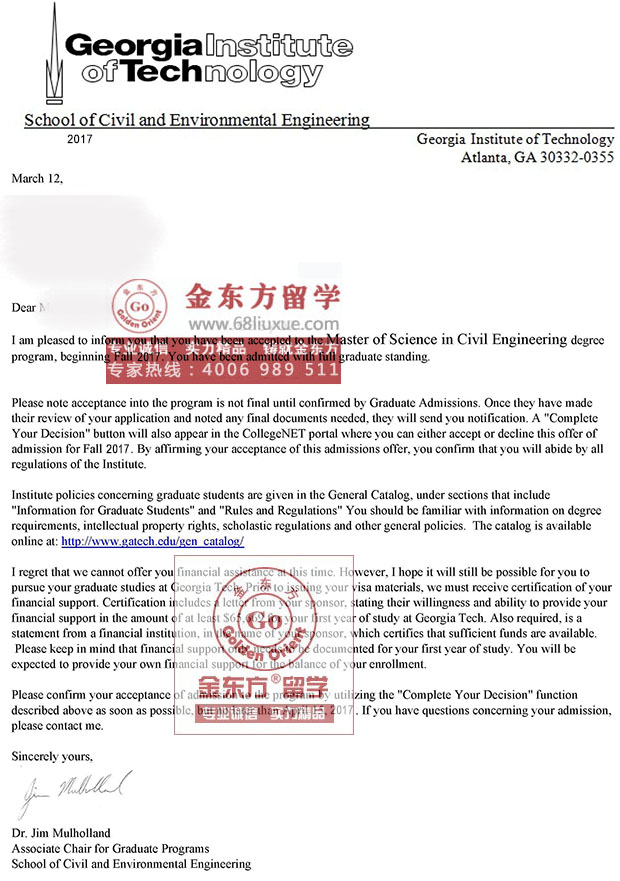 录取结果:Georgia Institute of Technology佐治亚理工学院, Master of Science in Civil Engineering (土木工程硕士)
