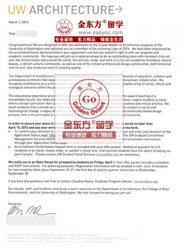 学校确认之后,紧接着是文书的雕琢。S同学是个行动力很强的学生,进入到申请阶段后,积极参与学校申请工作。这种良好的配合为之后申请工作的顺利展开打下良好铺垫。S同学独立性强,也有自己的想法,但是对于申请步骤了解比较陌生,所以,有时提出的想法显得不是非常契合申请所需。为了做好万全准备,为了让申请生效,资深留学文案老师和学生多次沟通文书中要展现的重点。如果涉及到素材取舍,老师也一定讲明采用A素材,舍弃B素材的理由,让S同学知其所以然。文书的精益求精加上合理的申请材料的准备,C同学终于成功拿下乔治华盛顿大学建筑学硕士的offer!